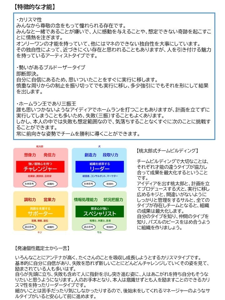 この鑑定書を使って自身のキャリアアップに使用したり、スタッフの特性を理解して、成果を最大化させるためのチームビルディングを行うこともできます。